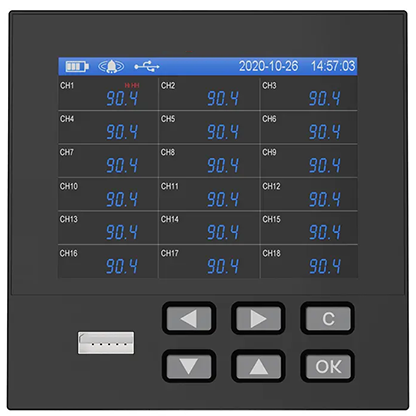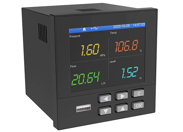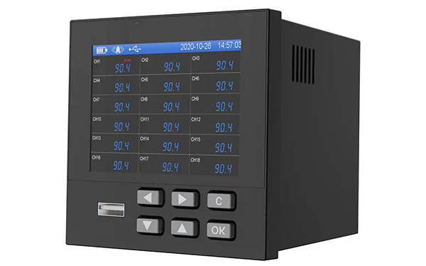 With a 3.5-inch TFT color display, operators can view real-time measurements, historical data, and alarm information directly from the front panel. The system stores recorded data in internal flash memory and protects it even during power interruptions.